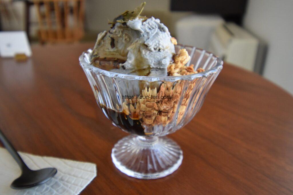 「黒パフェ」800円。台湾で親しまれている仙草ゼリーを使ったパフェです。初めて食べましたが、癖がなく自然な甘みのゼリーです。上には食べられる茶葉がのっています。