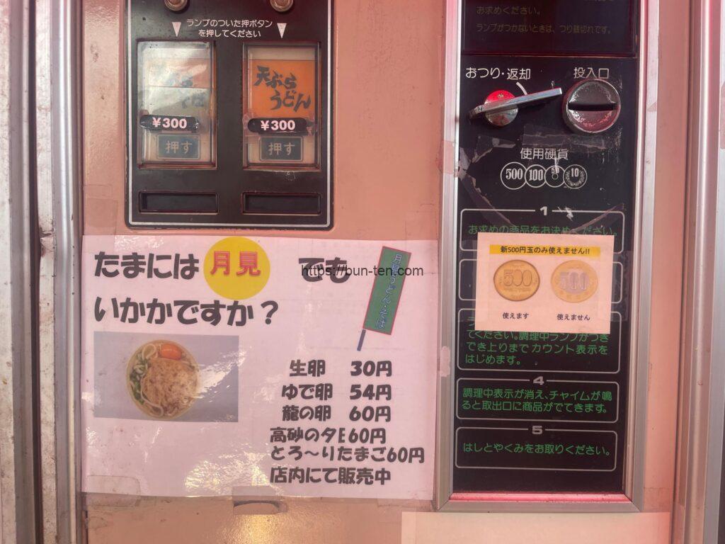 今回は、生卵「高砂の夕日」(1個60円)を購入。(卵はそのまま手渡しされるので、麺に入れる前に割ってしまわないようにご注意を!) そして300円を投入し、25秒待ちます。