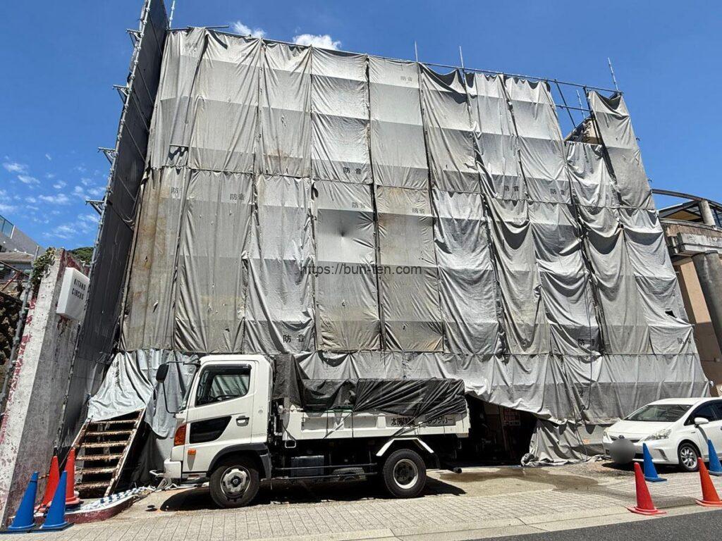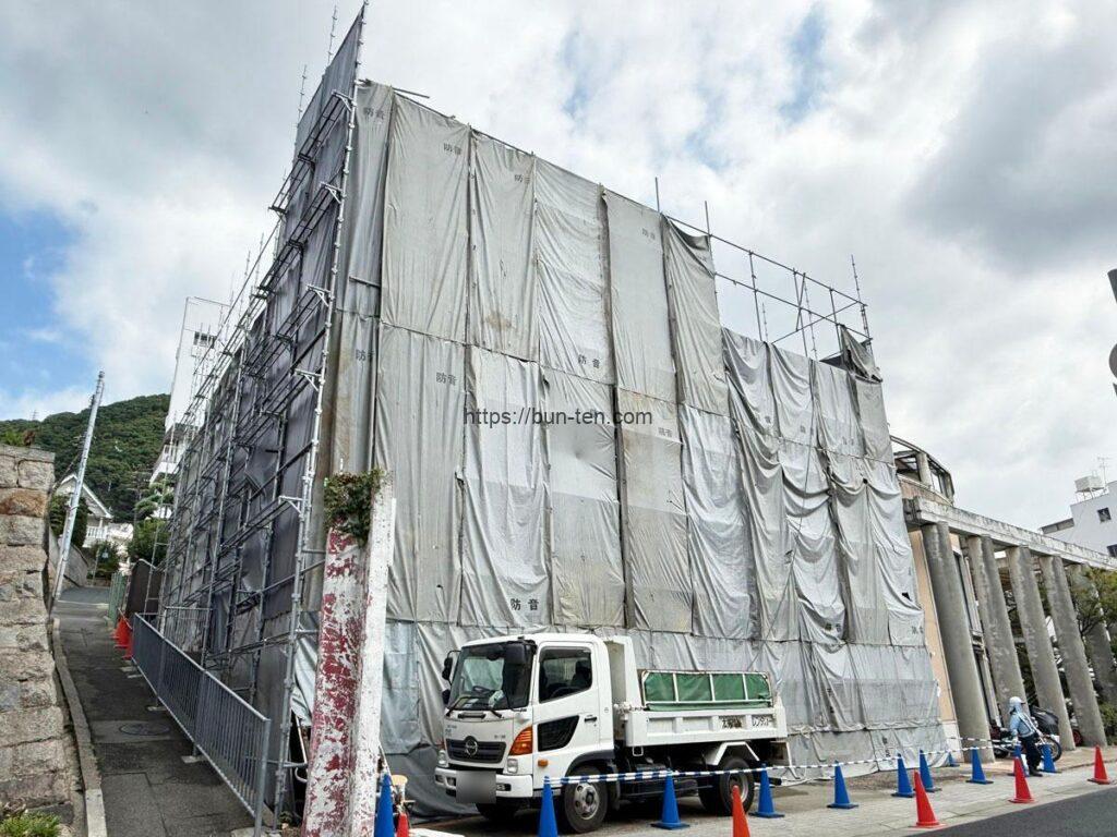 工事の足場が組まれ、建物側面の全面と、正面の出入り口に防音シートが設置されました。