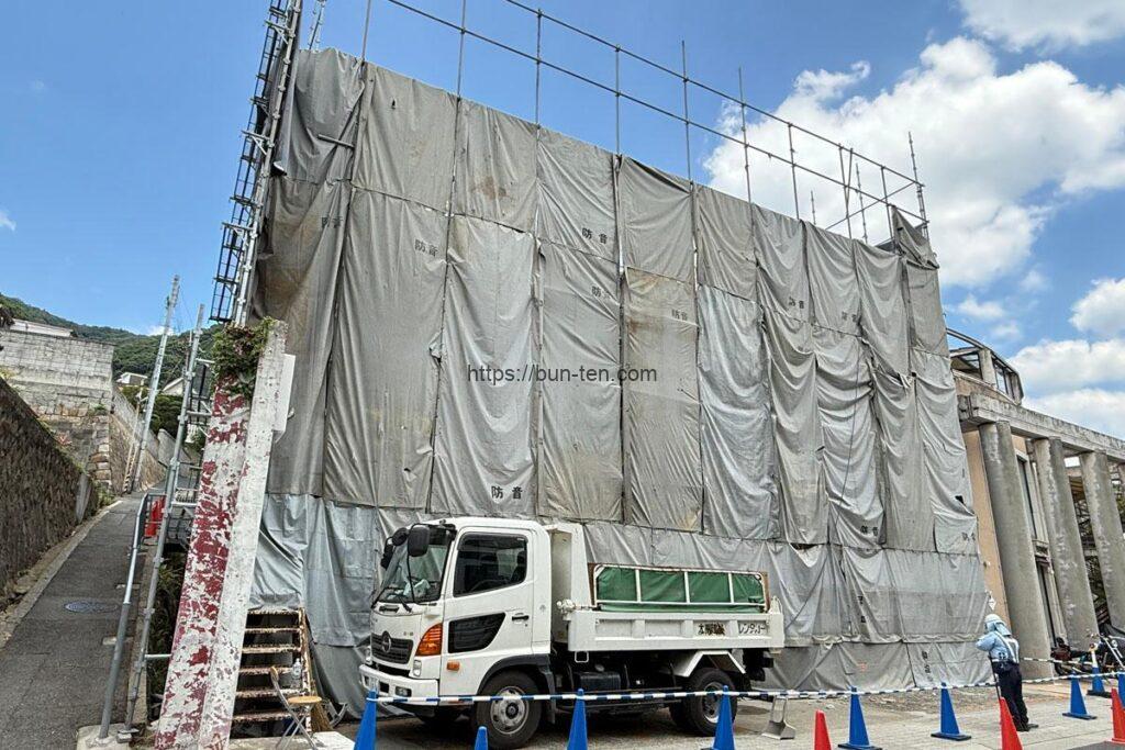 工事の足場が組まれ、建物側面の全面と、正面の出入り口に防音シートが設置されました。