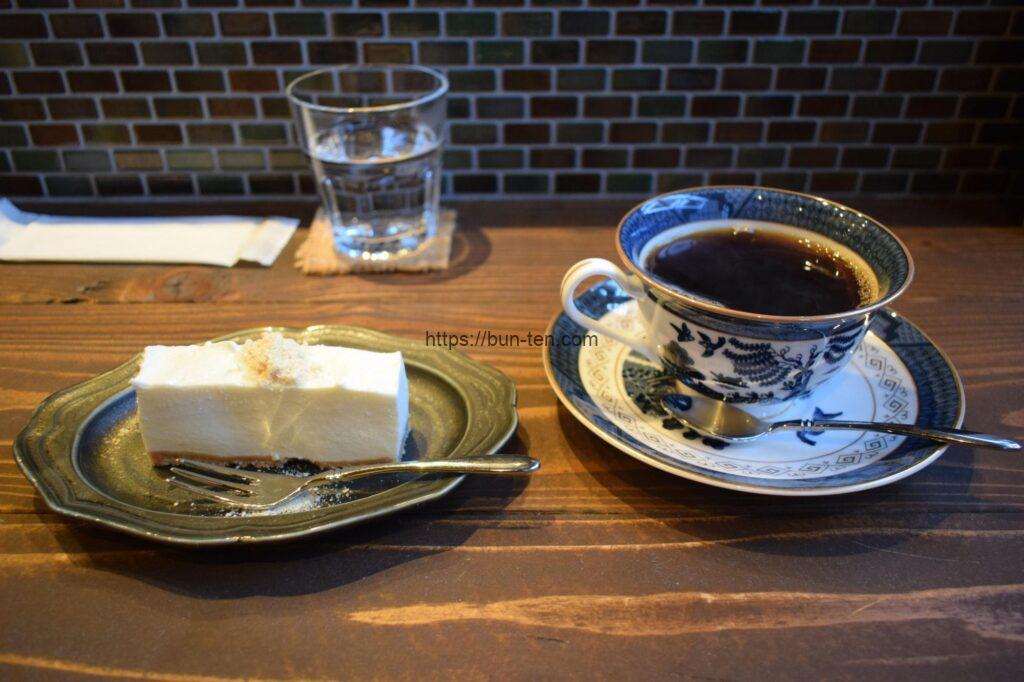 レアチーズケーキ(450円)と、ブレンド2番(500円)。ドリンクセットで50円割引が適用され、セット価格で900円でした。