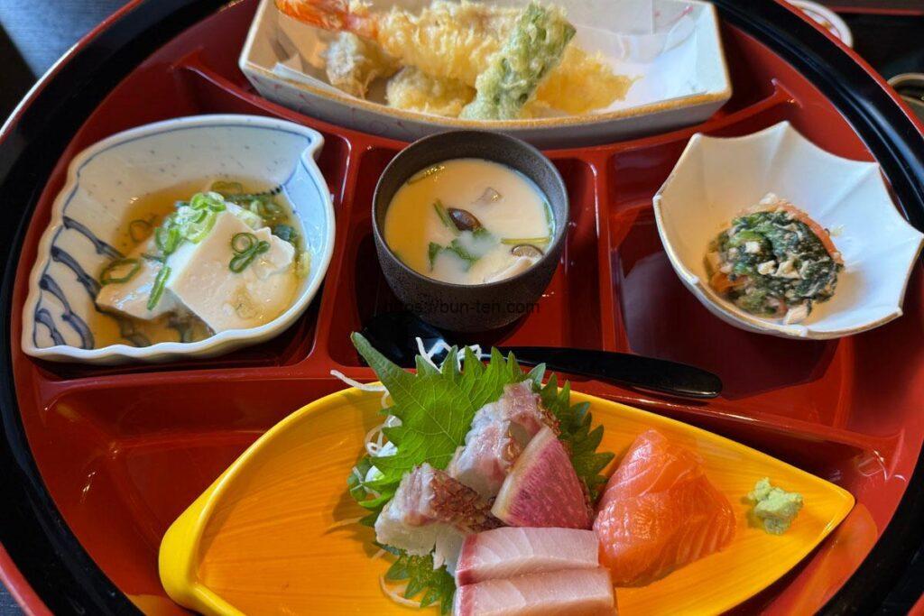 内容は、鮮魚のお造り3種盛り、大海老天ぷら盛り合わせ、自家製茶碗蒸し、本日のおばんざい、季節の替わり小鉢、御飯、お味噌汁、香の物。