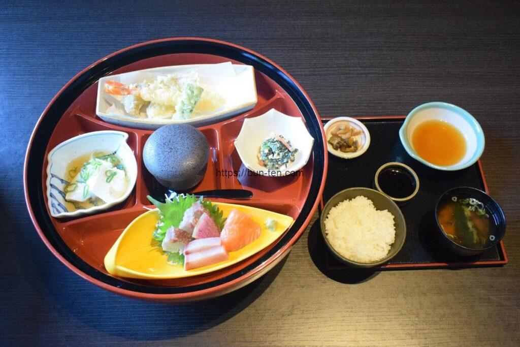 内容は、鮮魚のお造り3種盛り、大海老天ぷら盛り合わせ、自家製茶碗蒸し、本日のおばんざい、季節の替わり小鉢、御飯、お味噌汁、香の物。